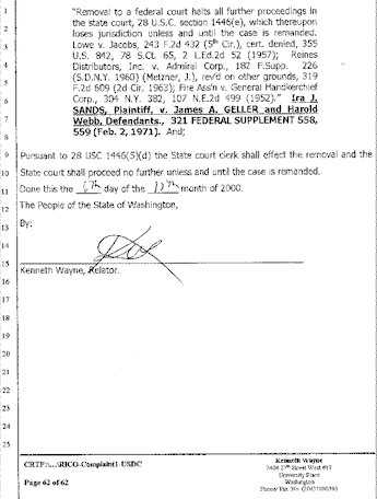 Pursuant to 28 USC 1446(5)(d) the State court clerk shall effect the removal and the State court shall proceed no further unless and until the case is remanded.
